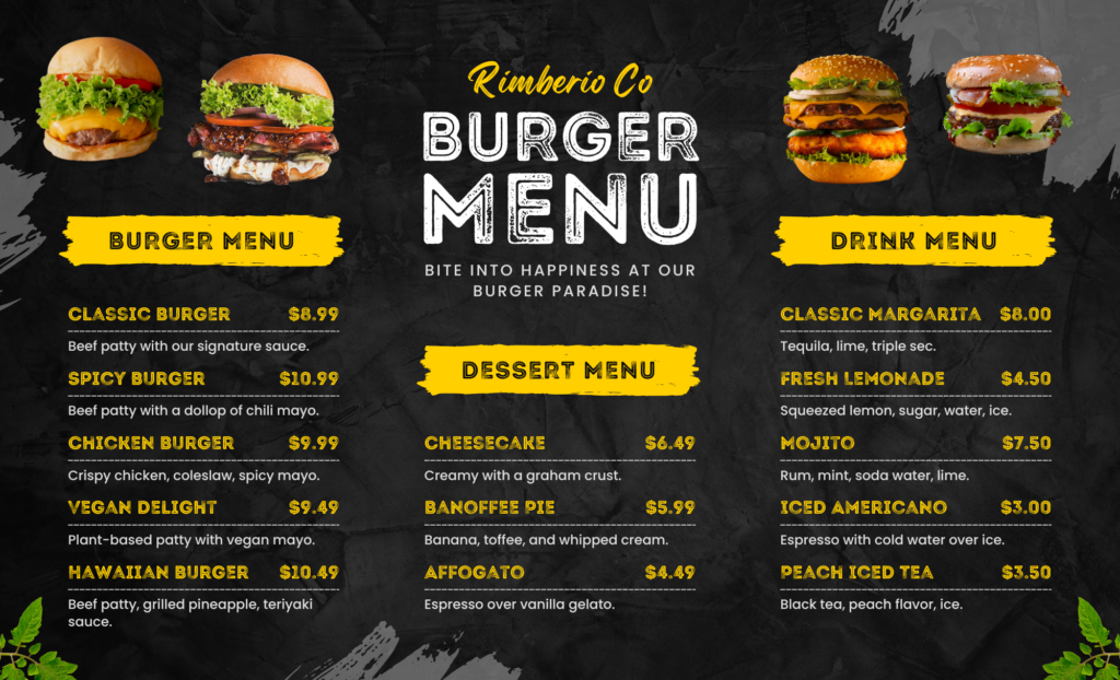 This Burger Menu features straightforward yet tasty burger options designed to satisfy your cravings efficiently and deliciously.